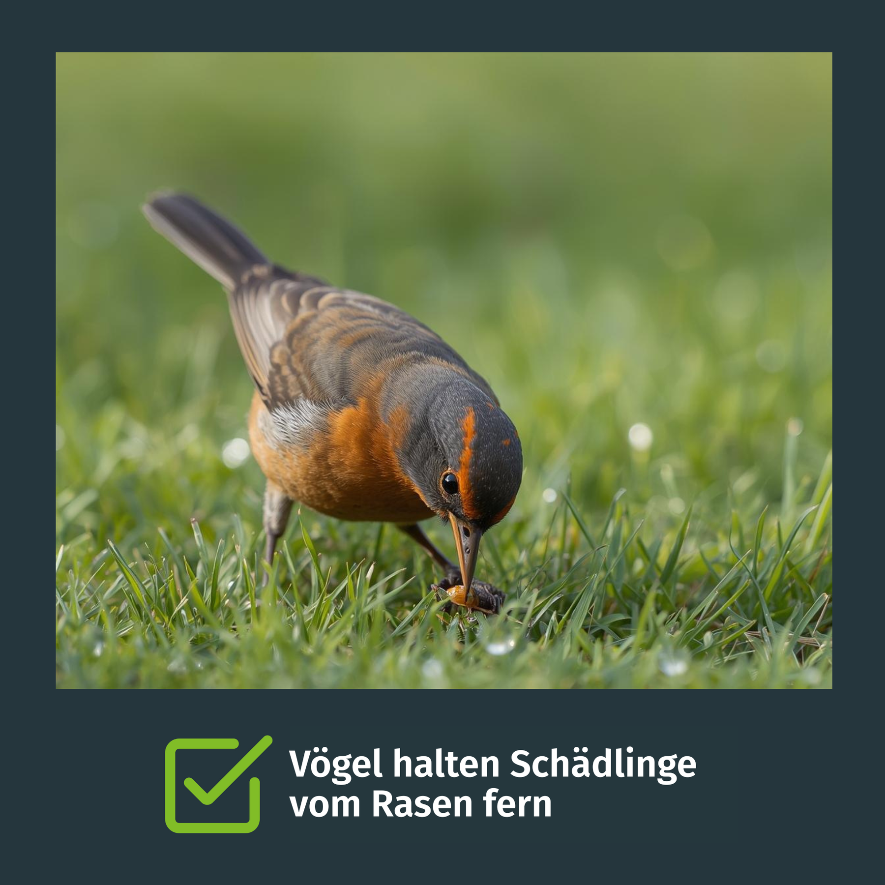 Wenn der Rasen Pause macht, übernehmen die Vögel. Aber was haben Wildvögel eigentlich mit dem Rasen zu tun? Wildvögel übernehmen sehr wichtige Aufgaben auf dem Rasen. Sie ernähren sich von Larven und weiteren Insekten und reduzieren somit potenzielle Schädlinge für den Rasen.