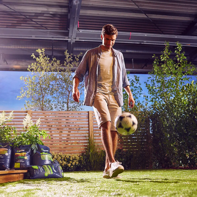 Für Thomas Müller steht fest: Ein Garten muss zum Wohlfühlen einladen – und das beginnt beim Rasen. „Ein schöner Rasen gehört für mich einfach dazu. Am liebsten so, dass man barfuß rausgeht und es richtig Spaß macht. Keiner hat Lust, in eine Matschpfütze oder ins Unkraut zu treten“, sagt der Fußball-Weltmeister.