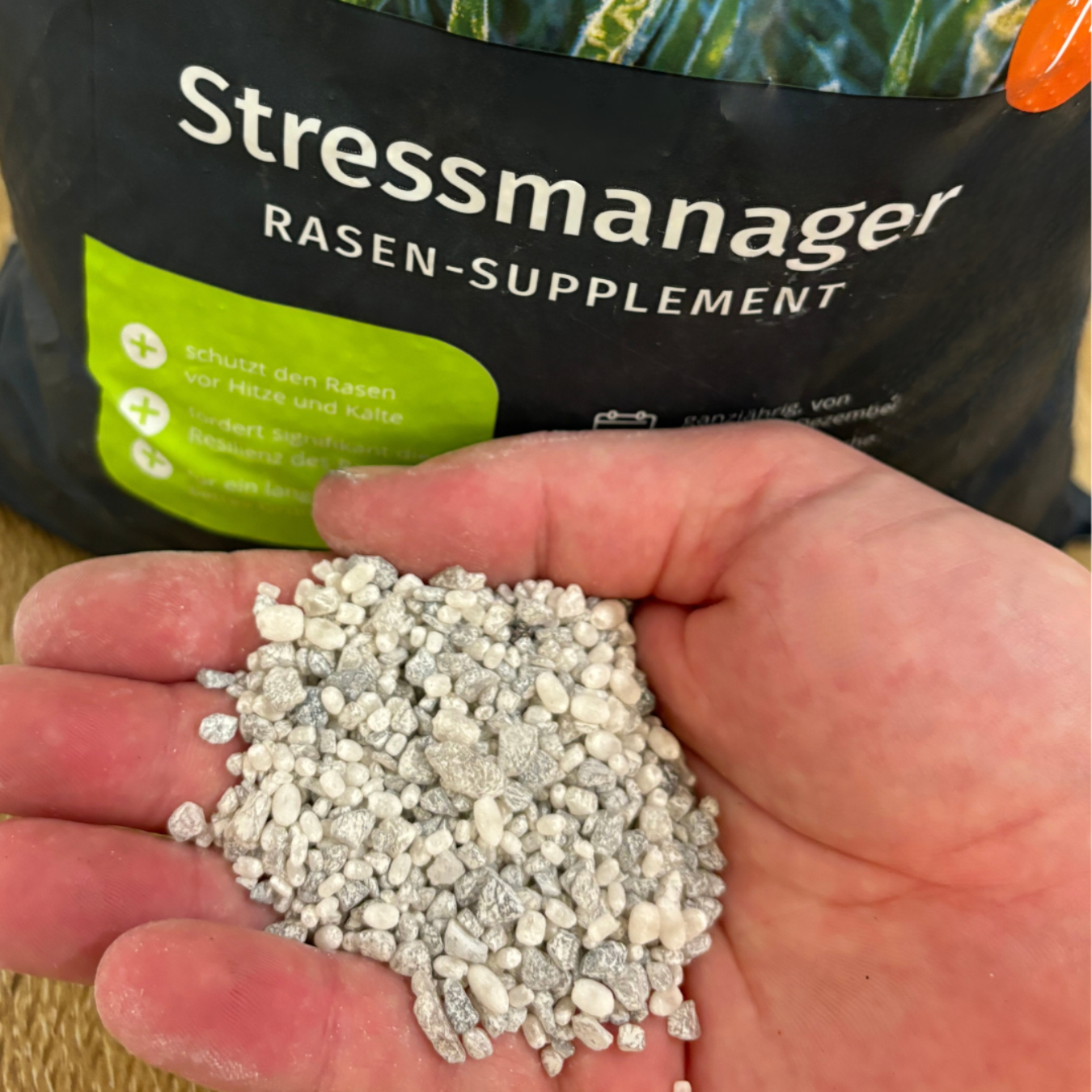 Reagiert dein Rasen gestresst auf längere Hitze- und Kälteperioden und hast du oft mit vertrockneten Gräsern und braunen Stellen auf dem Rasen zu kämpfen? Da Kalium unter anderem den Wasserhaushalt der Gräser optimiert, kann diese verminderte Hitzeresistenz mit einem Mangel zusammenhängen. Neben einer ausreichenden Bewässerung im Sommer, die dem Problem entgegenwirken kann, sollte idealerweise etwas gegen seine Ursache (den Kaliummangel) unternommen werden. Dafür eignet sich unser Stressmanager ideal.